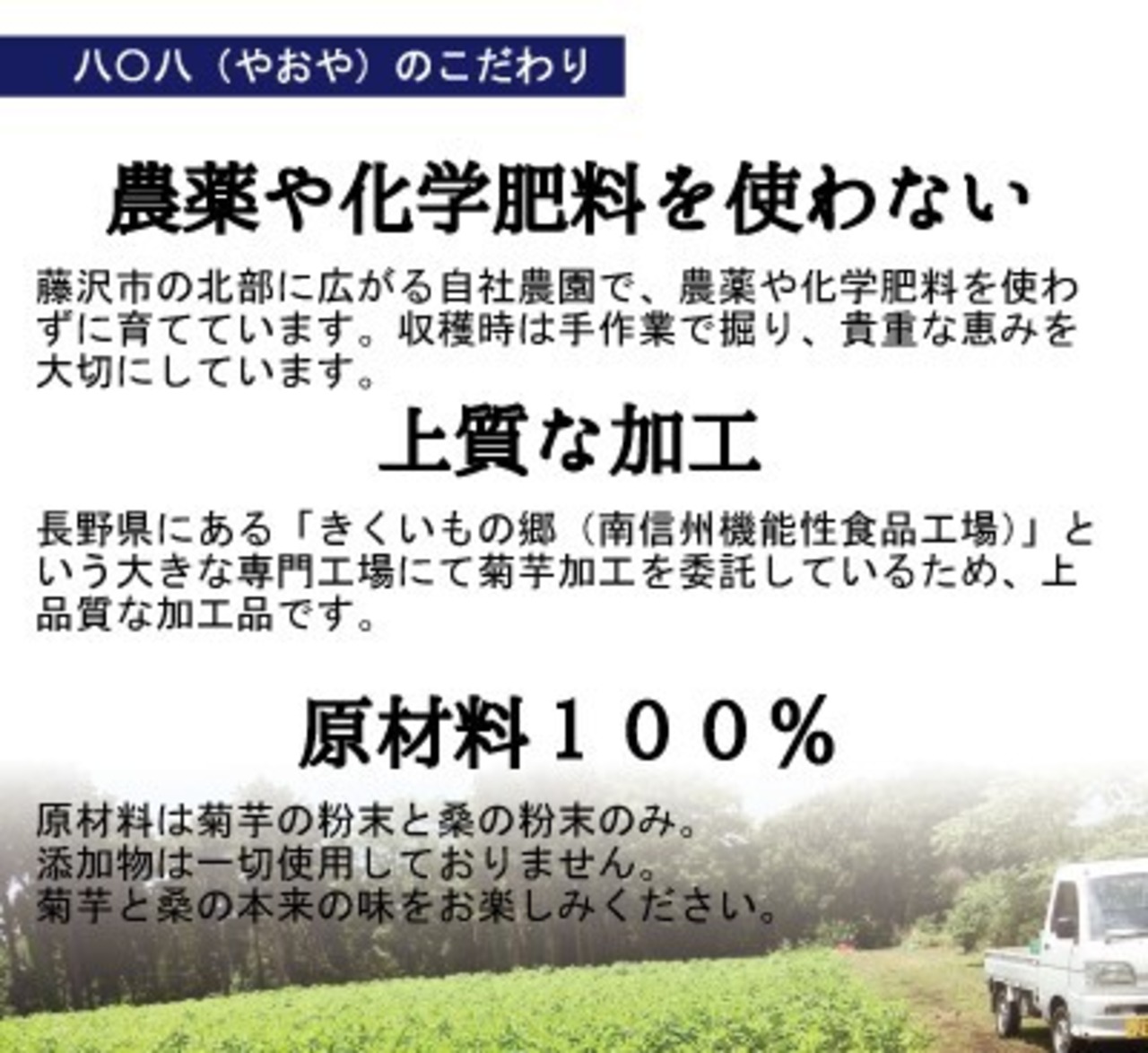 栽培期間中農薬不使用・無消毒・無殺菌にこだわって育てられた山梨県産の桑を配合。原料は、菊芋と桑の葉のパウダーのみ。菊芋の香り・甘味が加わり、クセがなくすっきり飲みやすい青汁です。