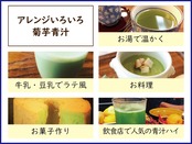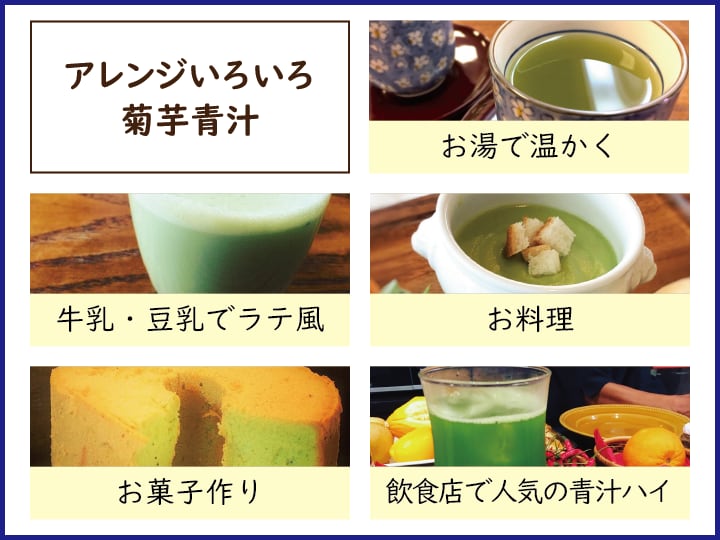 お湯で溶かしたり、牛乳や豆乳でラテ風に。ケーキやパンナコッタなど、お菓子作りに加えても楽しいです。焼酎を入れた菊芋青汁ハイは、神奈川県藤沢市の飲食店で大好評。